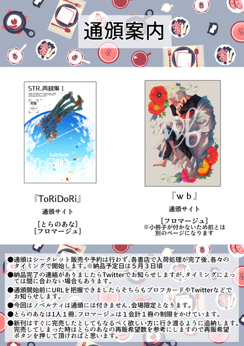 イベントのお品書きです 質問いただいた当日の冊数制限など、詳細載せていますのでご確認ください。こちらの画像が確認できない方はpixivのキャプションにも同様の注意書き載せてます👈 また、本日事前通頒あります🙏 pixiv.net/artworks/10332…