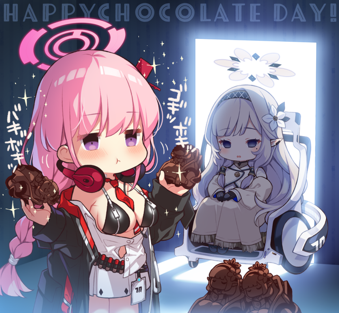 バレンタインに自分の姿のチョコを作ったヒマリと、その試作品がそこそこあったから超天才清楚系病弱美少女ハッカー(複製品)をおいしく食べてるエイミです。 #ブルアカ #BlueArchive