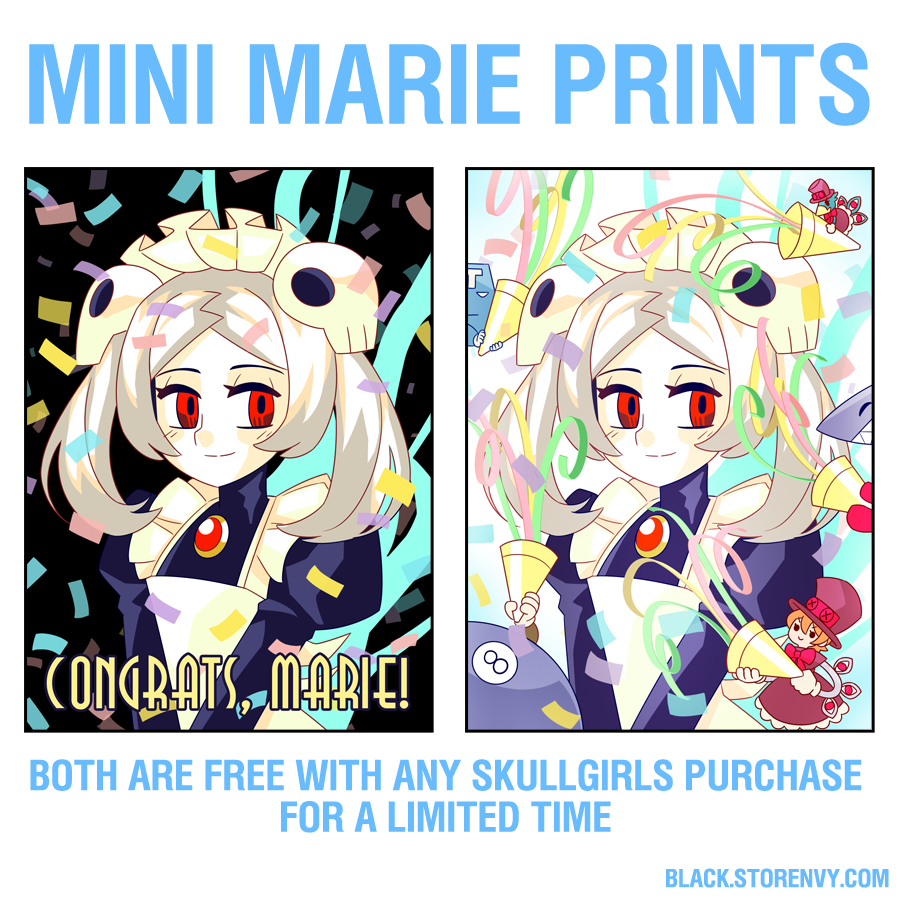 Heads up!! Our new ⚠SKULLGIRLS EVO MERCH⚠ is finally available online! black.storenvy.com Any SG order comes with a 🎉Marie🎉 postcard drawn by @artist_black! twitter.com/personasama/st…