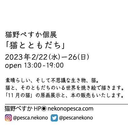 17 65 遅れに遅れておりますが、2月22日、猫の日からの個展、なんとかやります! よろしくお願いいたします〜! *** 猫野ぺすか個展「猫とともだち」 2/22-26 FALL・西荻窪 #猫野ぺすか #西荻窪fall #猫とともだち #ウッドバーニング #猫のいる暮らし #猫イラスト #シロクマ #ホッキョクグマ 23/02/12 14:17