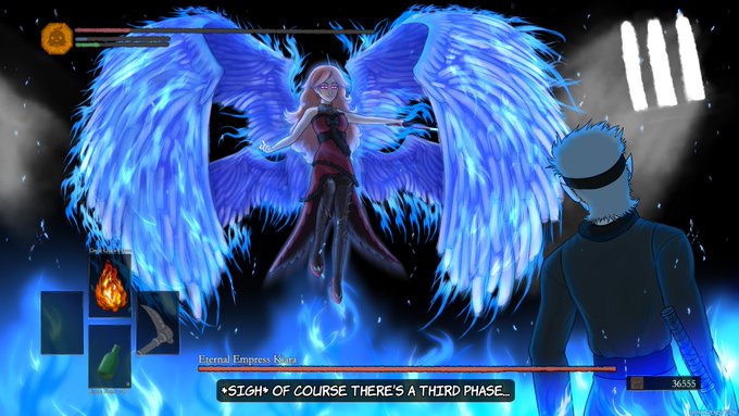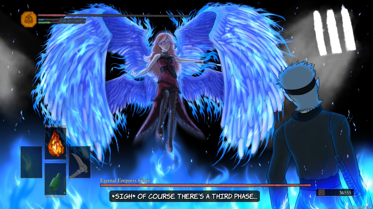 "A new era has begun. The Empress Era." - Takanashi Kiara Decided to challenge myself this time, so Kiara is now not just a boss, but a Dark Souls boss. #ArtsOfAshes (Also I didn't forget to draw the ear feathers. They're only present for phases 1 and 2 that I didn't draw yet)