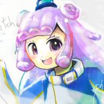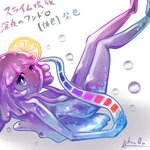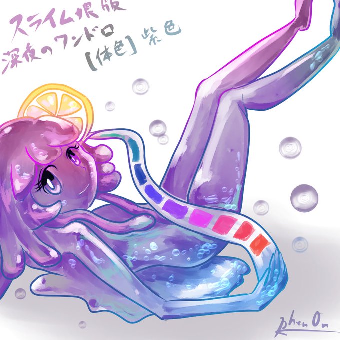 #スライム娘版深夜の真剣お絵描き60分一本勝負 遅刻参加です💦 お題【体色】「紫色」 アントシアニン色素を含む紫色のスライムは、周囲の溶液の性質によって少しだけ赤くなったり青くなったりするのだとか。 (ホウ砂水で作るスライムに酸を混ぜると溶けてしまうそうなので気を付けてください💦)
