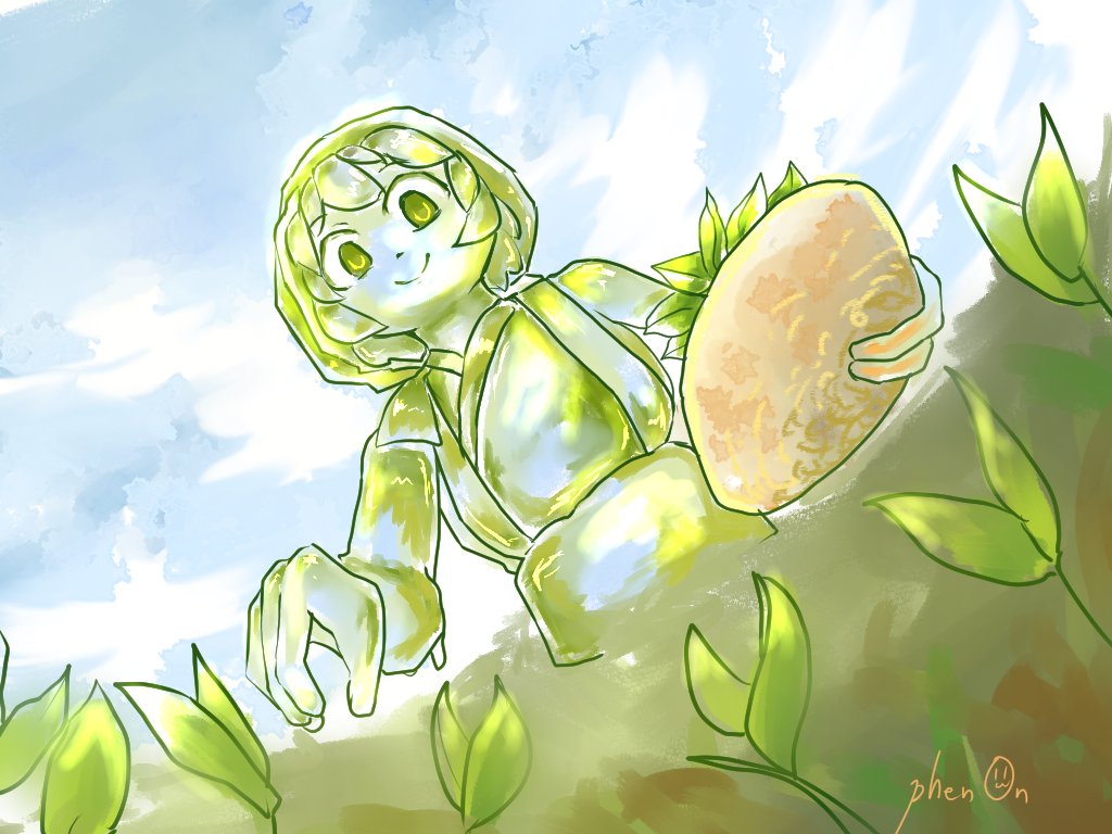 #スライム娘版深夜の真剣お絵描き60分一本勝負 お題:【材質】「お茶」(遅刻参加です……!) 夏も近づく八十八夜……にはまだ早いですが、 新緑の季節になると元気になる子たちがいます。 彼女たちが丁寧に摘んだ柔らかい新茶は、その地方の高級特産品としてこれから全国に出荷され始めます……!