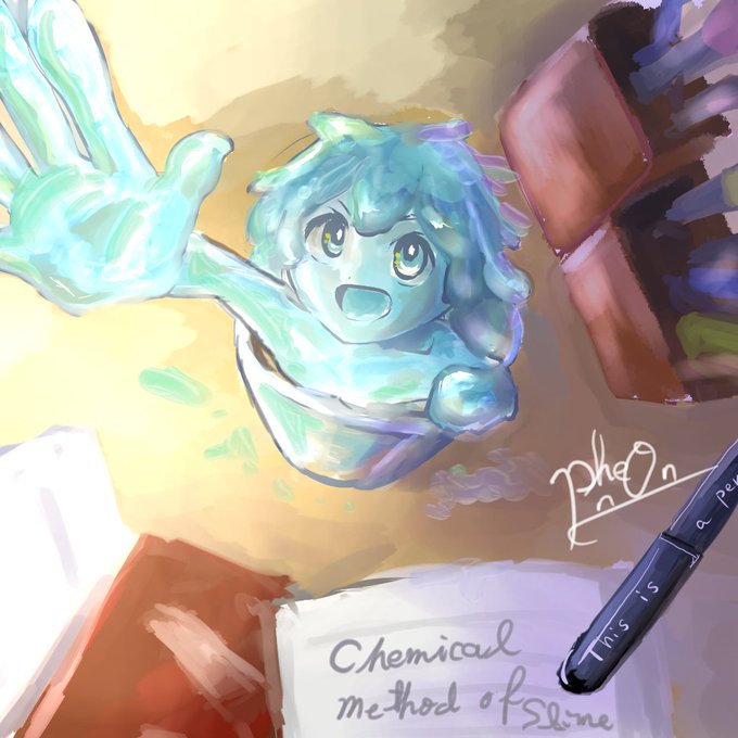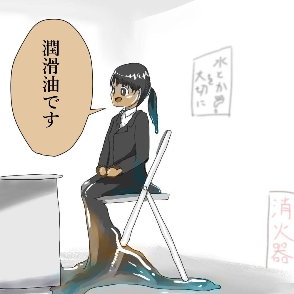 #スライム娘版深夜の真剣お絵描き60分一本勝負 お題[キーワード]嘘・擬態 スライムだってニンゲンの会社に採用されたい。 持ち物もマナーも完璧、面接練習だってたくさんしてきました。 迎える本番、緊張の高まる中、面接官は彼女に問いかけます。 「……それではまずお名前を教えてください」