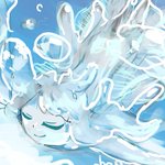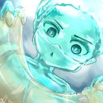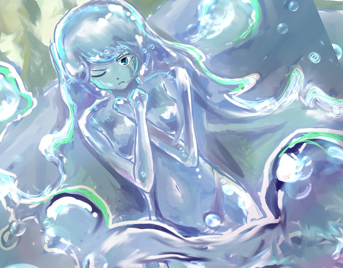 #スライム娘版深夜の真剣お絵描き60分一本勝負 【キーワード】「ウンディーネ」 森の奥の湖に住む水の精霊である彼女は、湖に近づく人間を水をかけて追っ払ってしまいます。水難事故予防とか環境のためだとか村では噂されていますが、なぜか人間が去ったあとにはとても悲しそうな顔をするのだとか…