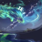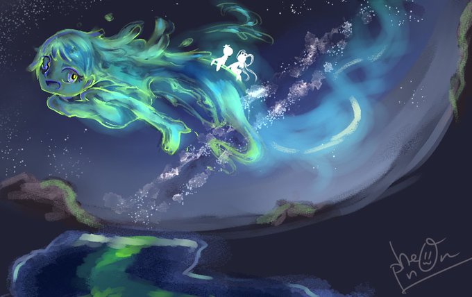 #スライム娘版深夜の真剣お絵描き60分一本勝負 お題:【体色】『緑色』 極たまに緯度の高い地方でみられるといわれています。とっても幻想的。 天の川をはさんだ2人を引き合わせるのは、かささぎだけではないみたいですよ。 #七夕 #オーロラ
