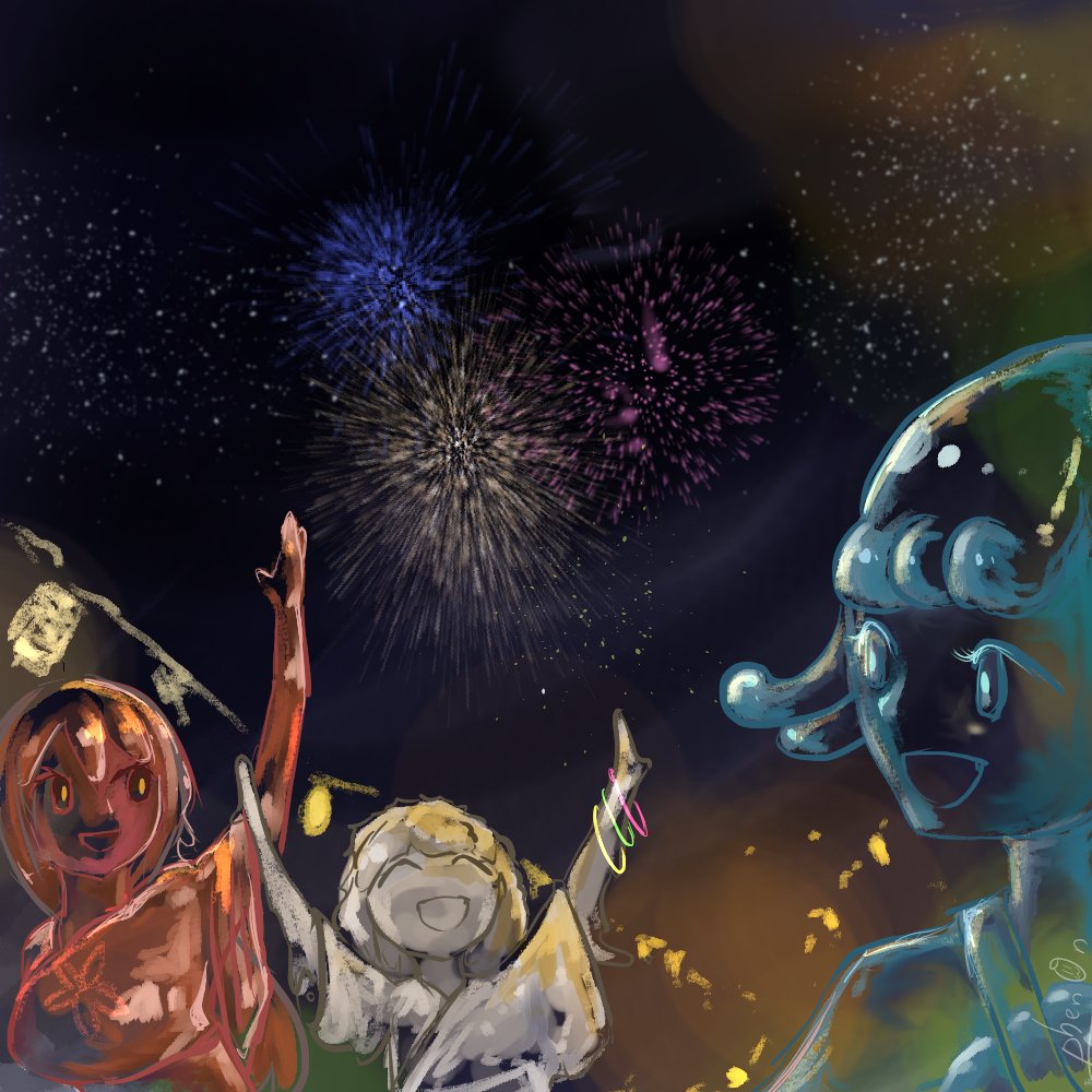 #スライム娘版深夜の真剣お絵描き60分一本勝負 【キーワード】「夏祭りで出会えるスライム娘」 瓶ラムネ、かき氷、りんご飴。 夏祭りには大人気ゆえに暇のない彼女たちも、終盤の花火になると店を出て仲間たちのところへ遊びに行きます。 光るアレは、店の主人が労いに買ってきてくれたものだとか。
