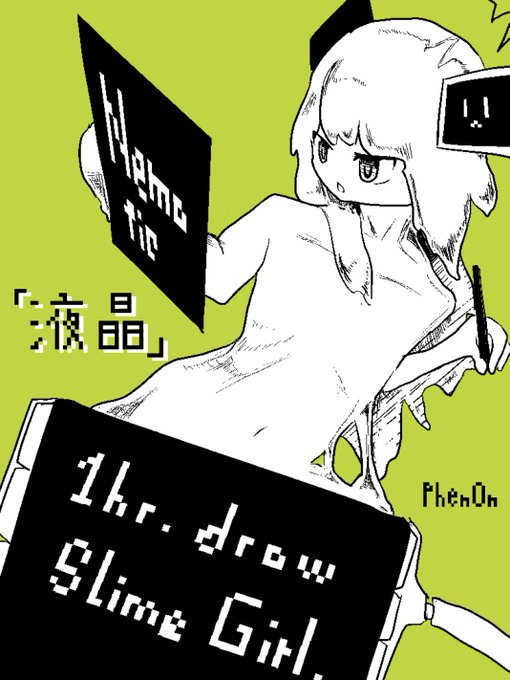 #スライム娘版深夜の真剣お絵描き60分一本勝負 お題:体色「白or黒」 遅刻参加です💦 実は普段からたくさんお世話になってる白いスライムちゃん、『液晶』。 偏光板に挟まって電流が流れるとあら不思議! 光の向きを自在に曲げ、思い思いの文字や絵を表現します。まさにクリエイターのお供すらいむ!