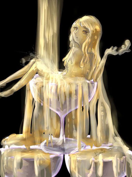 #スライム娘版深夜の真剣お絵描き60分1本勝負 お題:「無色透明」 ということで、水ガラスの子を描きました。 その体の一部を接着剤に使われるほど、とても粘稠性の高い子。そのくせ酸っぱい思いをするとすぐに固まってしまう、繊細で取扱いの難しい子でもあります。素手で触れるとケガをしますよ。