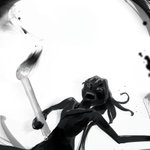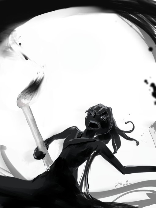 #スライム娘版深夜の真剣お絵描き60分一本勝負 お題:黒色 遅刻参加です💦 書に生きる墨汁スライムちゃん。 幼い頃は周囲をよく汚す自身を疎ましく思っていた彼女でしたが、成長するにつれ体の粘性をコントロールする能力と自信を身に着け、今では大人気の書道パフォーマーとして活躍しています。