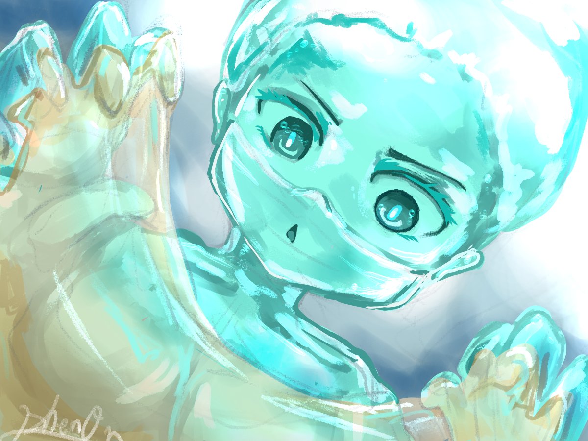 お題:【キーワード】「ペットのスライム」 時間外参加です…💦 #スライム娘版深夜の真剣お絵描き60分一本勝負 あの日、ぼくに小さな手を伸ばしてくれた、 たったひとりのおともだち。 ひんやり冷たいはずなのに、 はじめて知ったあたたかいきもち。