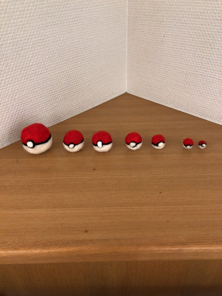 1 3 家族の付き添いの為、朝から病院でカンヅメ状態🏥 時間がたっぷりあったので大量生産し、許可を得て廊下に飾って貰いました。 マトリョシカ方式でどんどん小さくしていった結果、親指の爪位まで小さくなりました(・∀・) #ハンドメイド #羊毛フェルト #ポケモン #モンスターボール 19/09/28 20:58