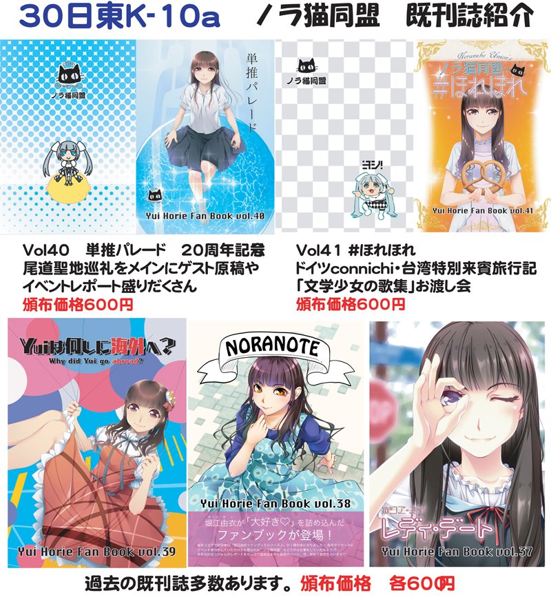 冬コミ当選しました。 12/30(木)東K10a「ノラ猫同盟」 新刊は、「堀江由衣ファンブックVol.42(仮)」 2019末に行われた文学少女倶楽部レポから直近まで。 今まで通りの内容になると思います。 詳しい内容やタイトルは決まり次第随時更新していきます。 よろしくお願いします! #C99