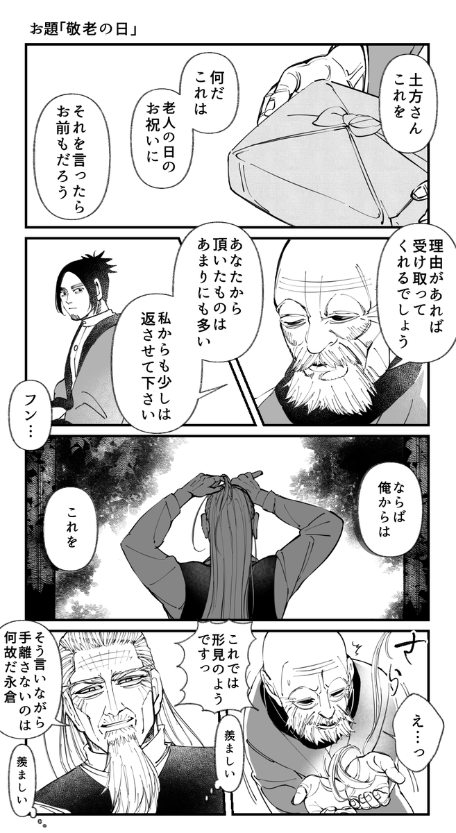 お題「敬老の日」 #ゴールデンカムイ版深夜の真剣お絵描き60分一本勝負 ⚠敬老の日は昭和以降誕生したもので明治当時にはありません。フィクションとしてご覧下さい〜! イケおじぃ描くの楽しいんじゃ