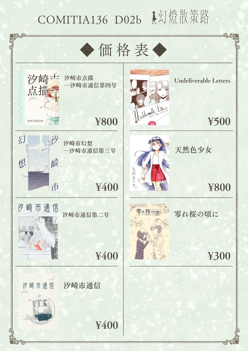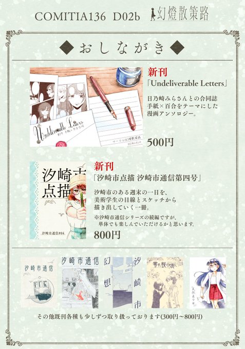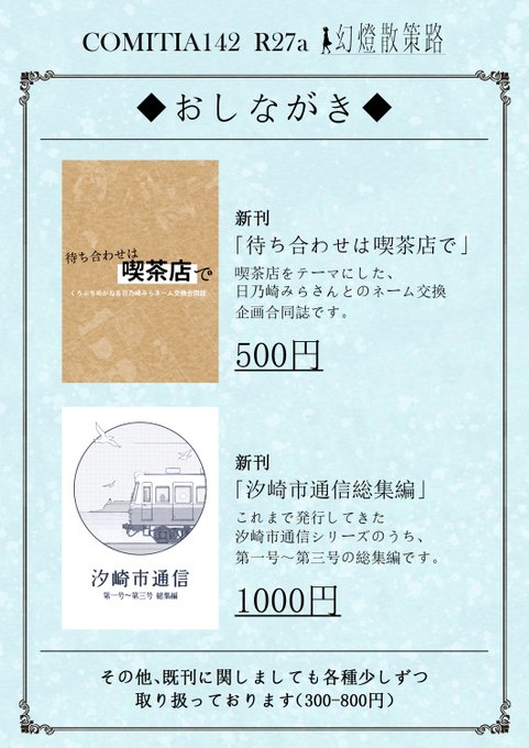 【おしらせ】 11/27開催のコミティア142お品書きが出来ました! 新刊は日乃崎みらさんとのネーム交換企画合同誌と汐崎市通信1~3の総集編本です。 既刊も全体的にあると思います。(一部品切れしていたらごめんなさい!) 当日はよろしくお願いいたします…! #コミティア #COMITIA #COMITIA142