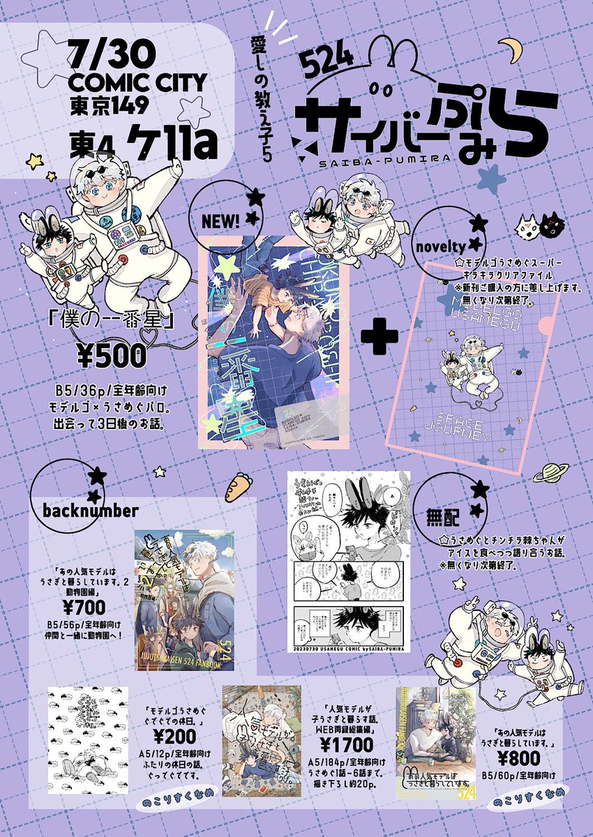 3 50 【7/30愛しの教え子5五伏新刊サンプル】1/2 「僕の一番星」 B5/36p/全年齢向/¥500(イベント会場価格) 五伏。モデルゴ×うさめぐパロ。WEBで掲載している「人気モデルが子うさぎと暮らす話」第一話の3日後のお話です。+ごぜうさん視点漫画。 23/07/16 12:16