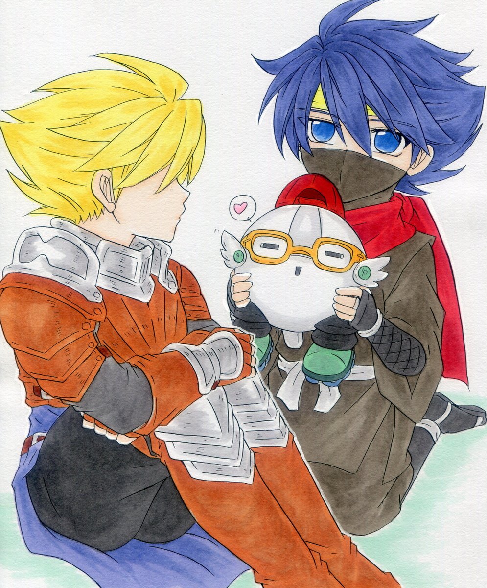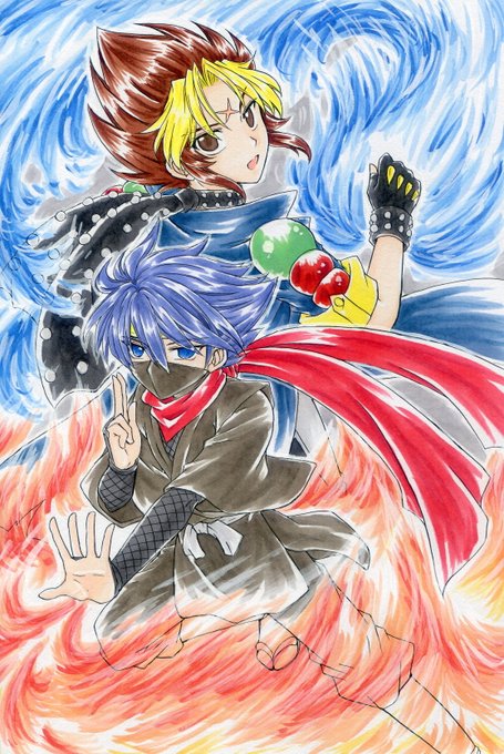 アキラとおぼろ丸。 同じ炎属性の技でも、アキラは青い炎、おぼろ丸は赤い炎ってのが良いよね~!と思って描きました。 #ライブアライブ