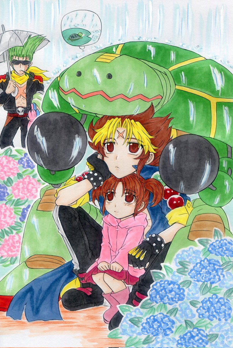 ライブアライブ絵。 近未来編で雨宿り。某漫画のタロイモが兄妹抱えてるの可愛かったので。 お迎えの松はレインコートとか傘持ってるけど見えなくなっちゃったなぁ