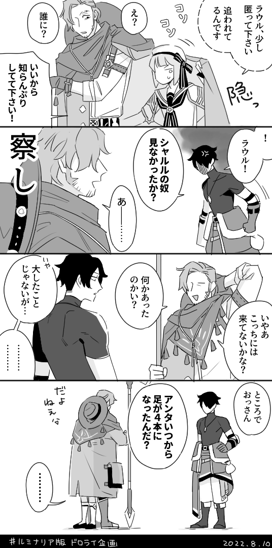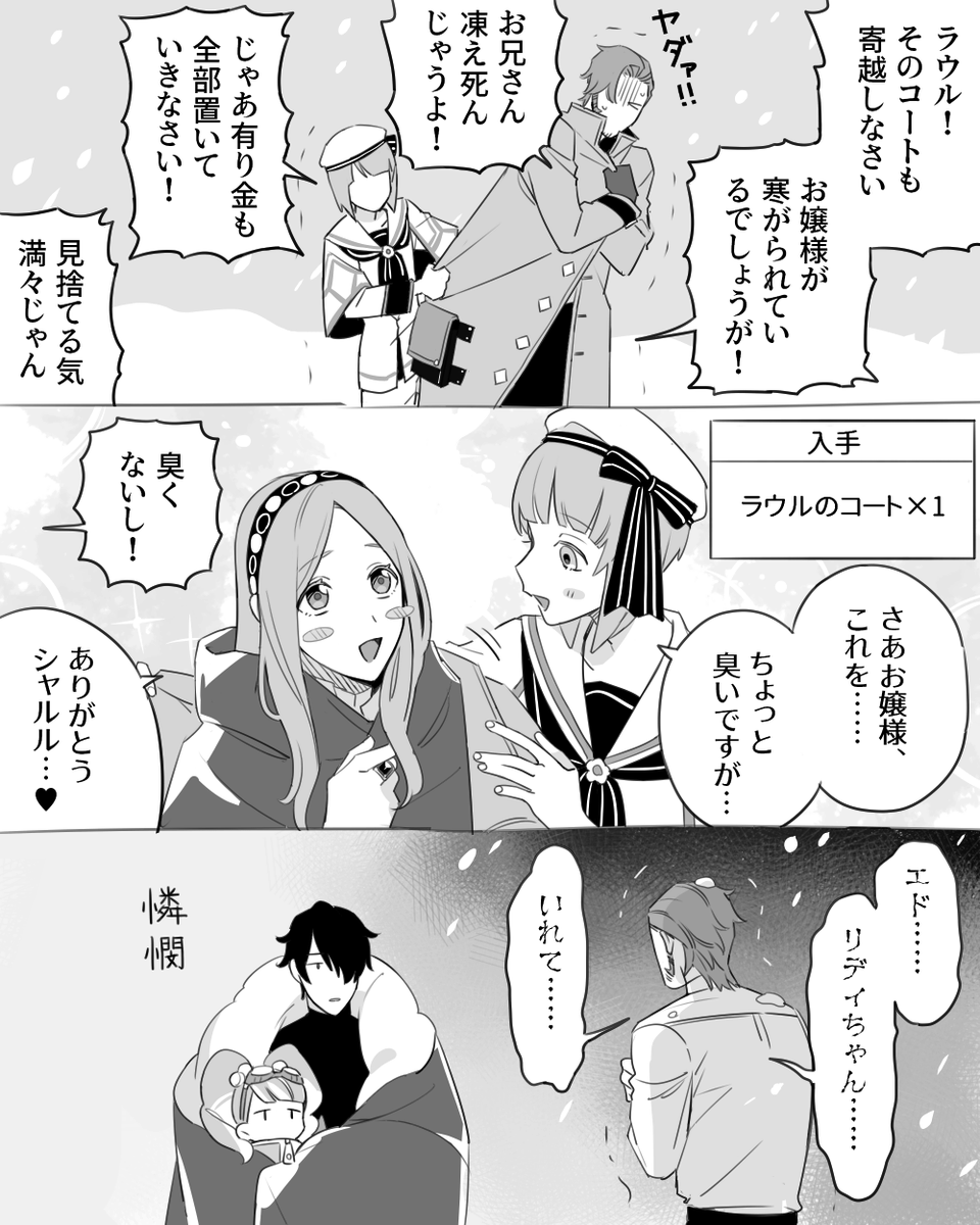 40 109 #ルミナリア版ドロライ企画 面白体験ではないけどラウルさんのコートにシャルルちゃんを隠すのがかわいくて楽しかったです お兄さん誕生日おめでとう! 22/08/10 22:03