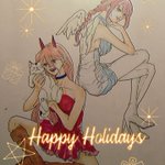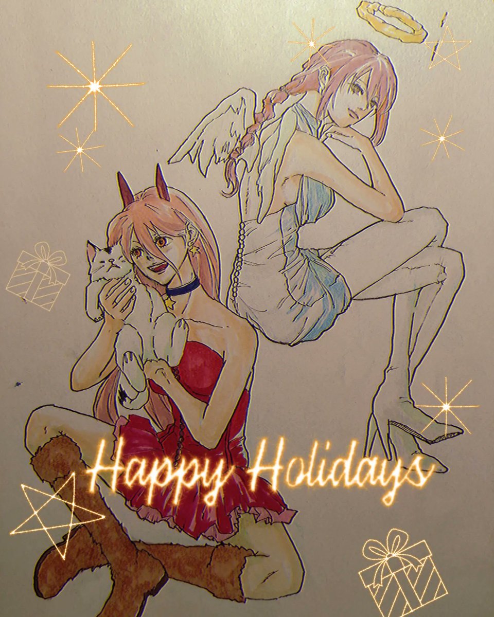 あと4時間で今日が終わるけど、あと4時間あるので各々実力出し切って今日という日を乗り切ってほしい(大丈夫、12時過ぎれば通常通りだから!!毎年のことだから!!!) #チェーンソーマン #Chainsawman #マキマさん #パワーちゃん #にゃーこ #アナログイラスト #MarryChristmas
