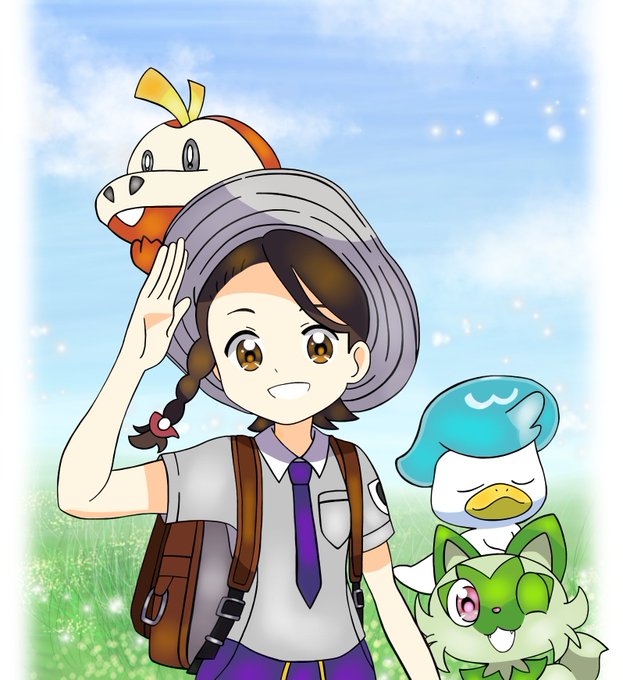 遅くなりましたがポケットモンスター スカーレット・バイオレット発売 おめでとうございます🎉🎉🎉 お祝いにアオイちゃんと 御三家を描きました! バイオレットゲット! ニャオハを選びました! #ポケモンSV #ポケモンバイオレット #ポケモン好きさんと繋がりたい #絵描きさんとつながりたい