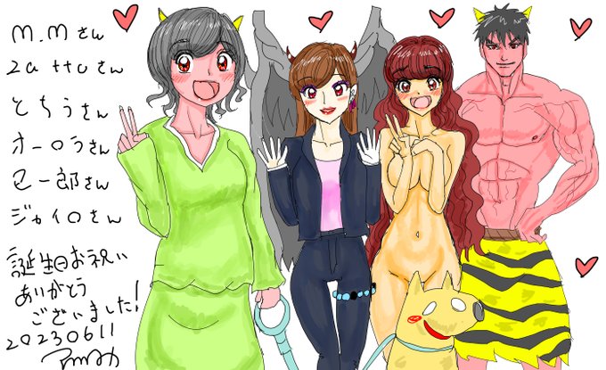 #絵描きさんと繋がりたい #ぴーまんすいかの誕生日 Mさん、zattoさん、とちうさん、オーロラさん、巳一郎さん、ジャイロさん 誕生日お祝いイラストありがとうございました!! 皆さんが描いてくださった私のキャラクターを去年に引き続き、皆さんが描いてくださった服装のまま描き下ろしてみました!