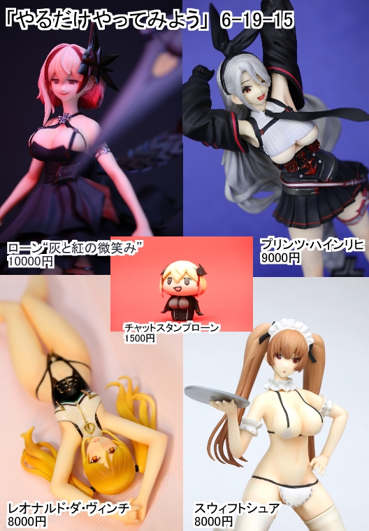 宣伝させていただきます ディーラー「やるだけやってみよう」 アズールレーン レオナルド・ダ・ヴィンチ ¥8000 アズールレーン スウィフトシュア ¥8000 アズールレーン プリンツ・ハインリヒ 9000円 アズールレーン ローン ¥10000 6-19-15でお待ちしてます #グリパンスペース #WF2023W