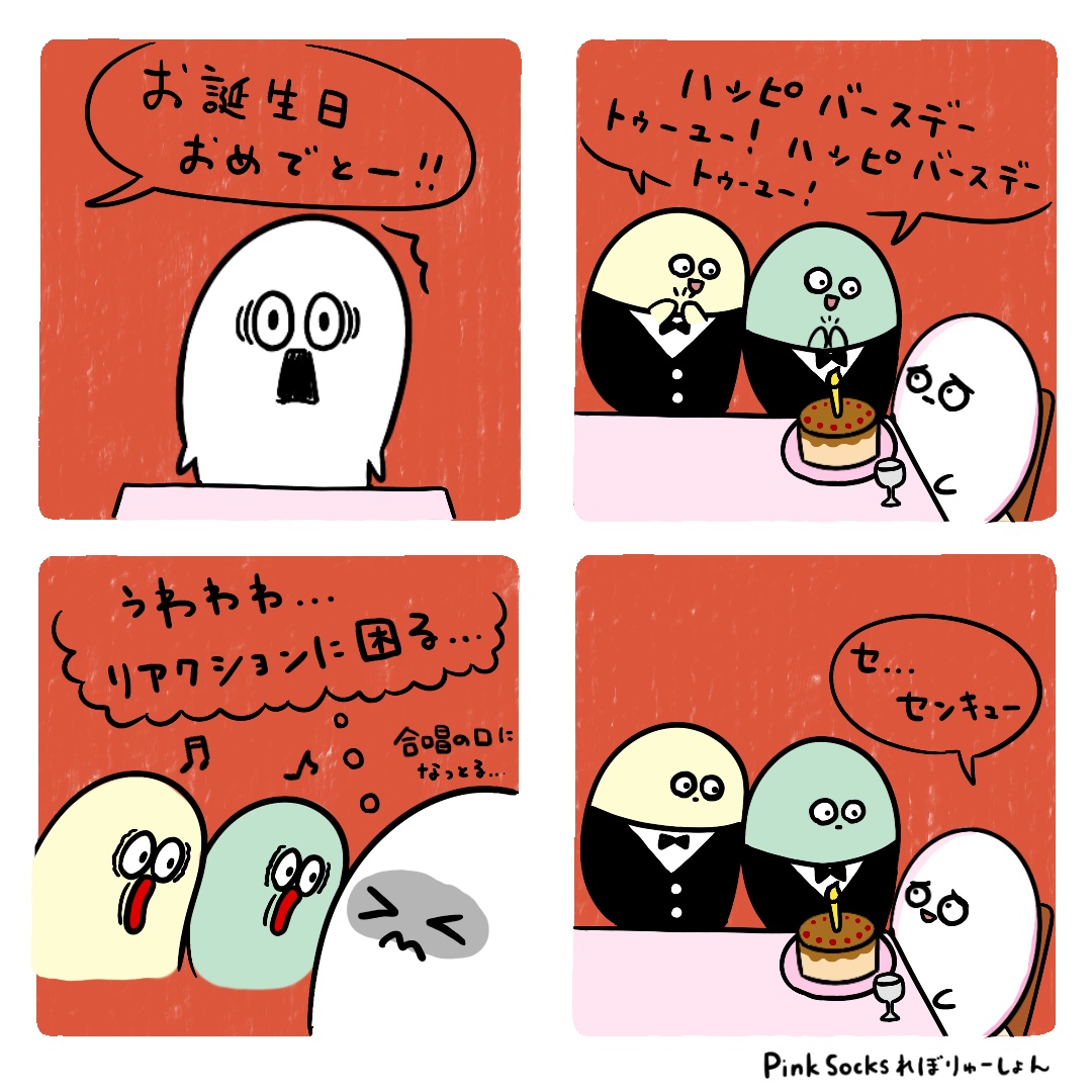 誕生日にバースデーソングを歌ってもらうのって、嬉しいけど苦手。モジモジが止まらない。レストランで店員さんが歌ってくれてる間、早く終われ!と心の中で唱えてるんだ。 #4コマ漫画 #イラスト #漫画の読めるハッシュタグ ※読み順、左右左右
