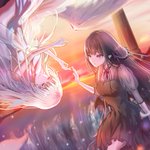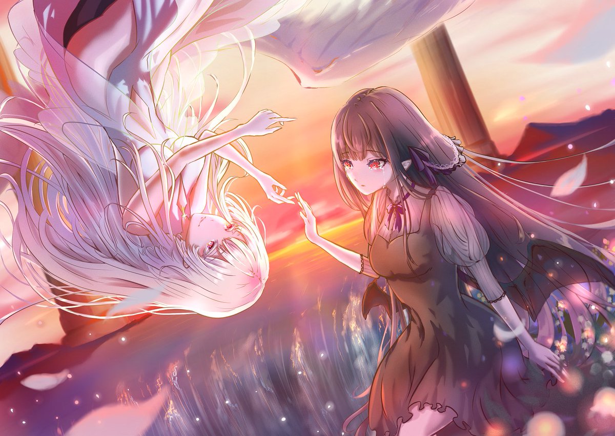 pixiv百合イラコン描きました✨ いつも描いている天使と悪魔ちゃんです( ´∀`) #イラスト好きと繋がりたい #百合 #私の絵柄が好みって人にフォローされたい #創作クラスタさんと繋がりたい #百合イラコン2 #いらすと #夕日