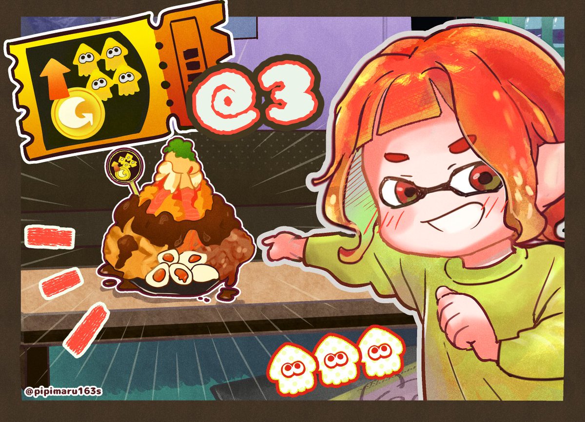 【スプラ3】全員お金2倍💰のフードチケット使用時限定!の募集イラストを描きました。 フレンドの皆さんでお金稼ぎしたい方は、ご自由にお使いください😄 #スプラトゥーン3 #ビッグマザーマウンテン #フリーイラスト
