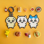 ちいかわ達、作ってみました! いつもなんか食べてるイメージがあるので食べ物と共に笑 作りやすいよう小さめ図案にしたので、ほっぺの斜線などはペン描きです! #アイロンビーズ #pixelart #ドット絵 #ちいかわファンアート
