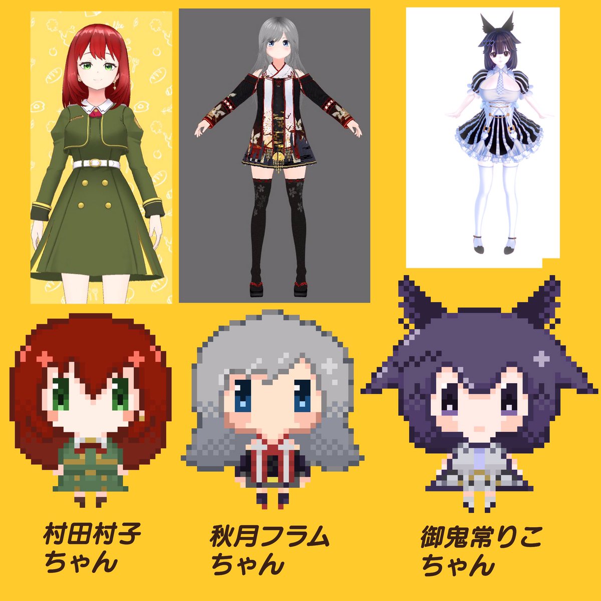 #Vtuber好きさんと繋がりたい #ドット絵 #pixelart #Vtuberが描いた絵を見てみたい 御鬼常りこちゃん@RICORICO_SHR1NE 秋月フラムちゃん@framvt村田村子ちゃん@MRT_REALITY をドット絵で描かせて頂きました❤️ありがとうございました🐻✨
