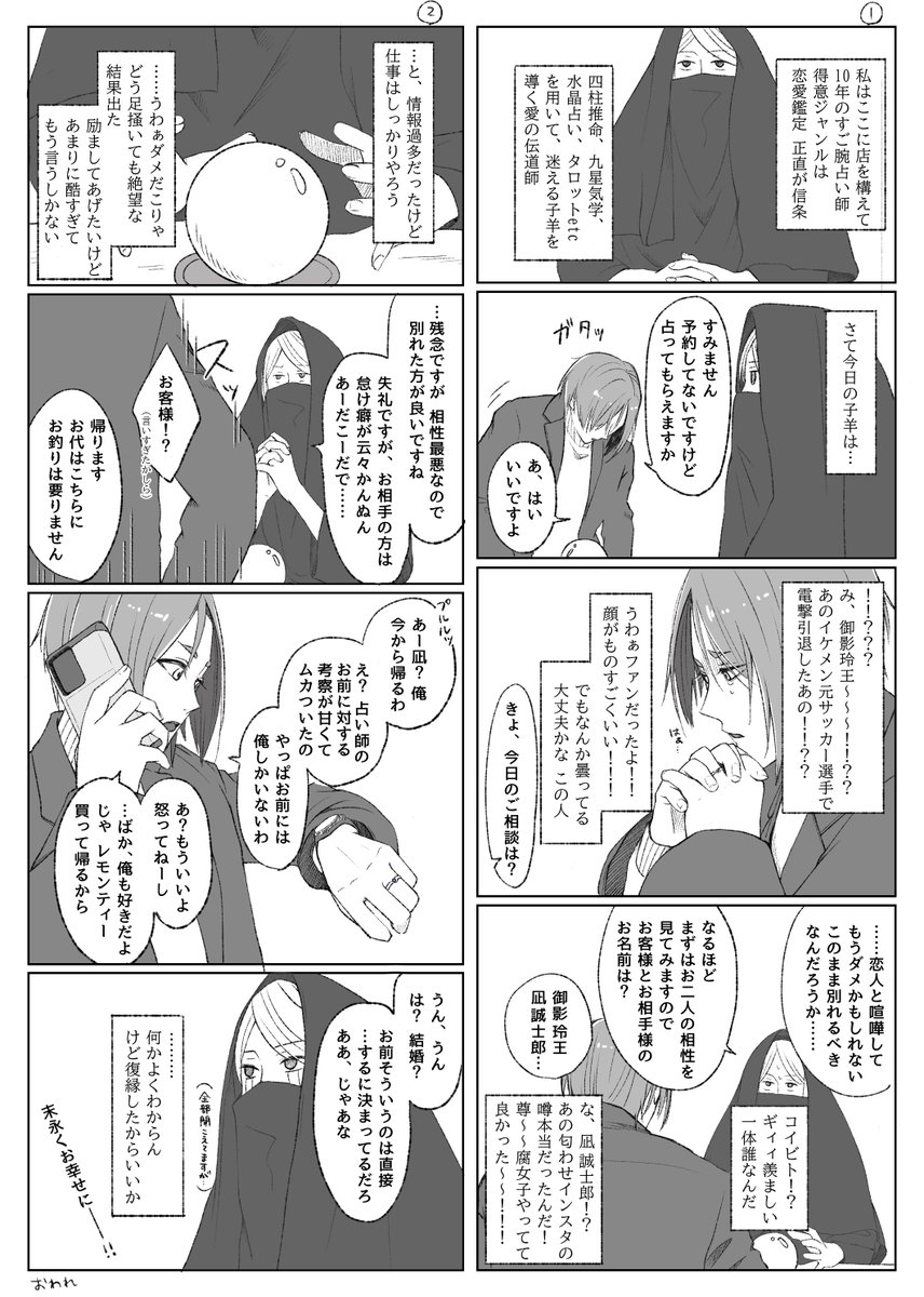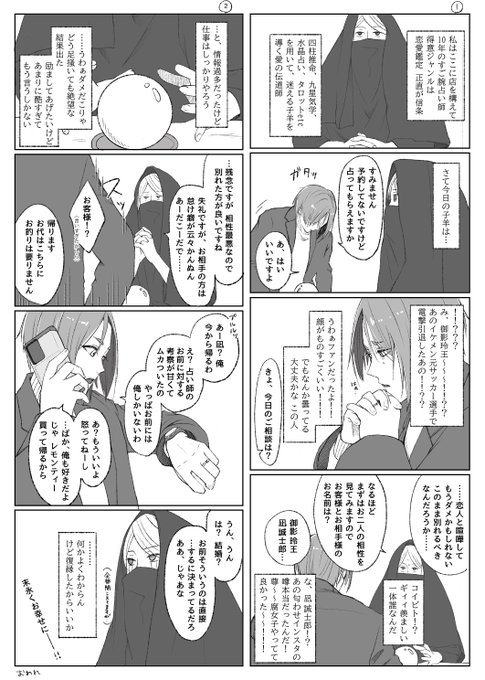 #凪玲版深夜の創作60分一本勝負 お題「占い」お借りしました! +1.5hぐらい 10年後あたり/ngは現役、roは引退済み設定 沈んだroが路上占い師に相談するngro漫画です (右上から下に読んでください)