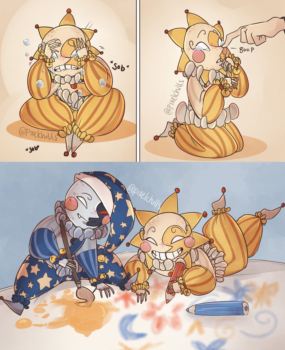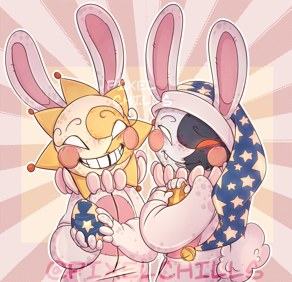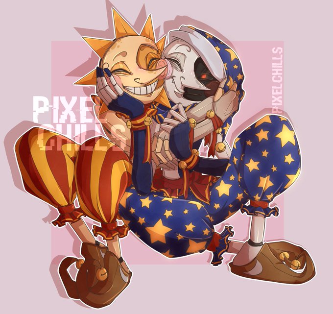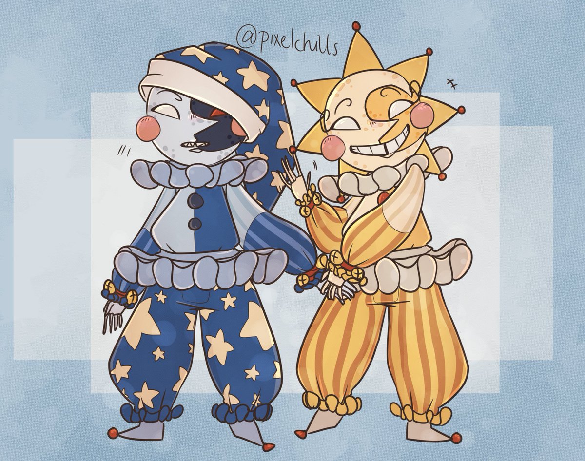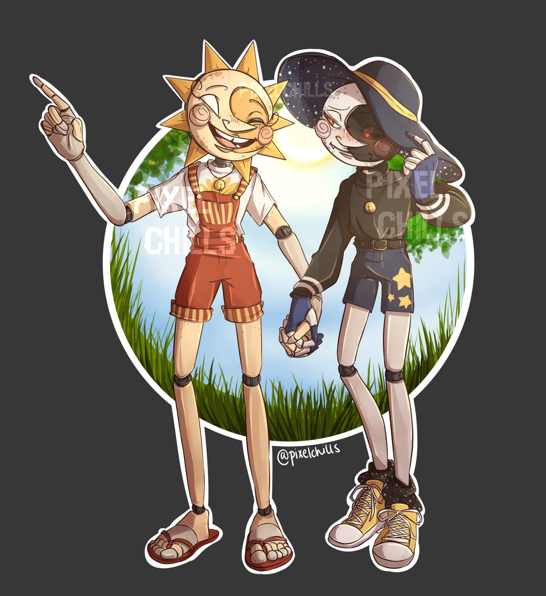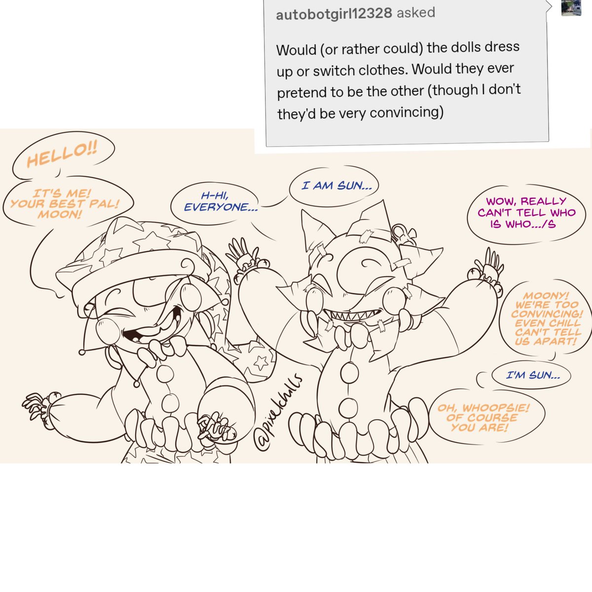 More attempts to get rid of the artblock. Little gift sketch for @BoneJanky of our cute dollboyos together! Patch probably cracked the funniest joke in a history that has DD Sunny rolling :D #dolldrops #fnafsun #fnafmoon