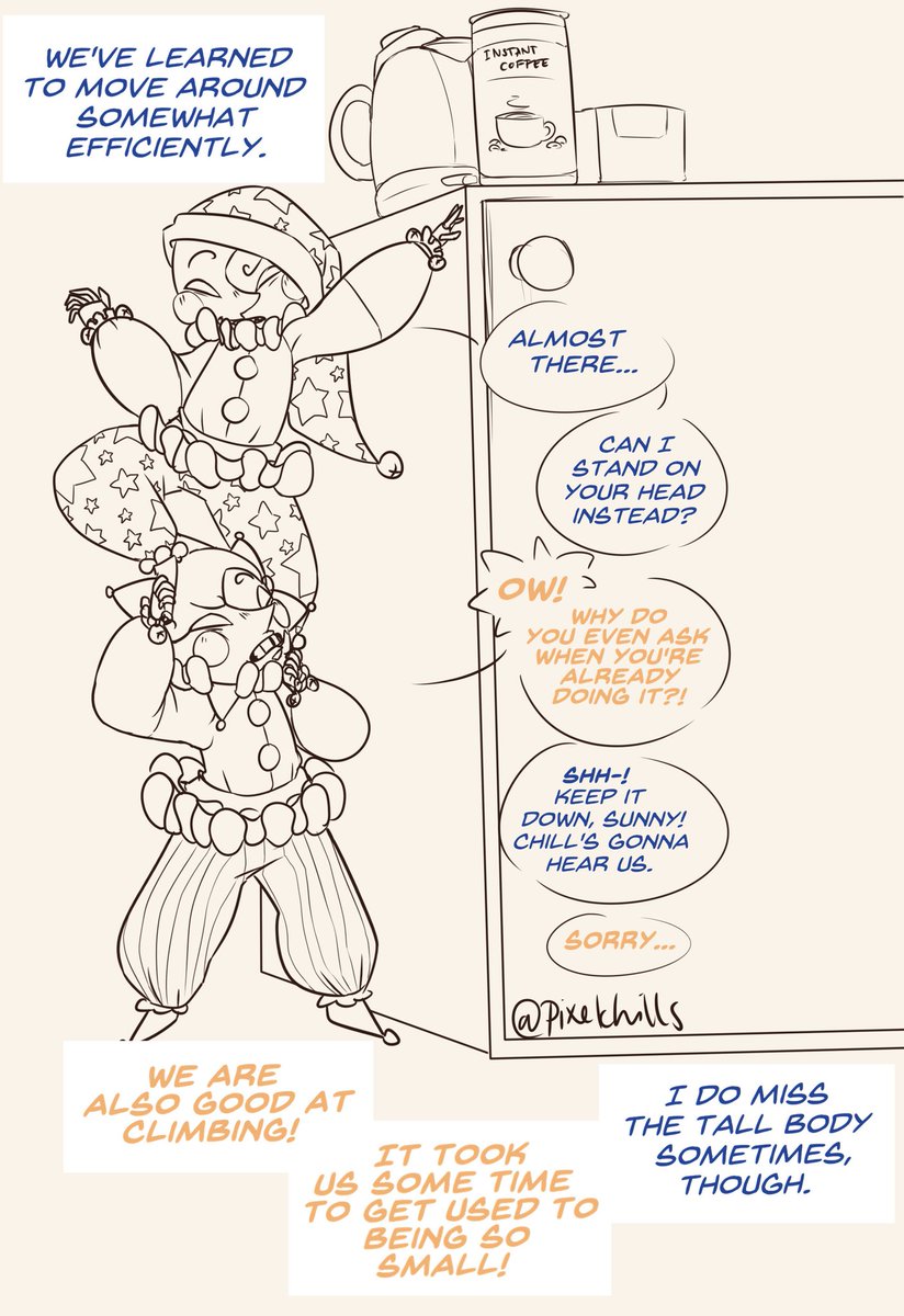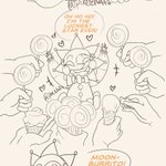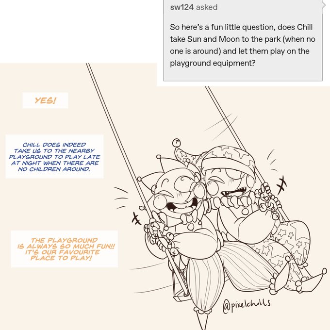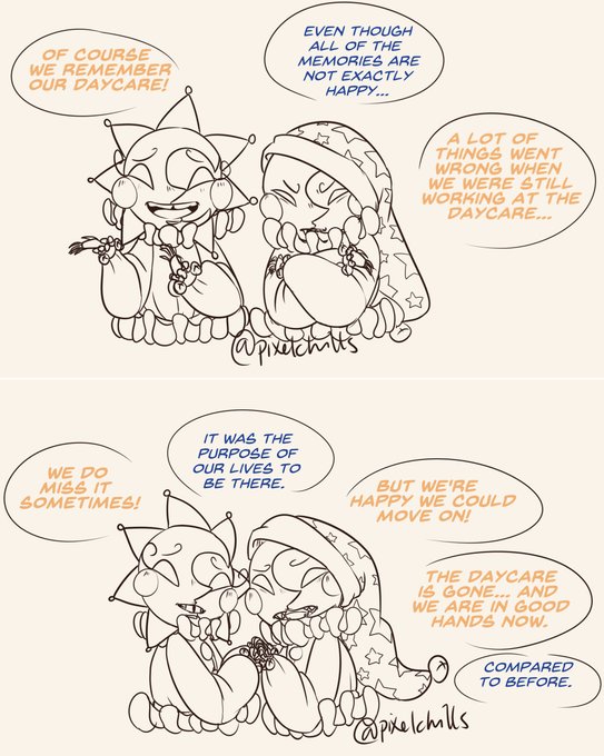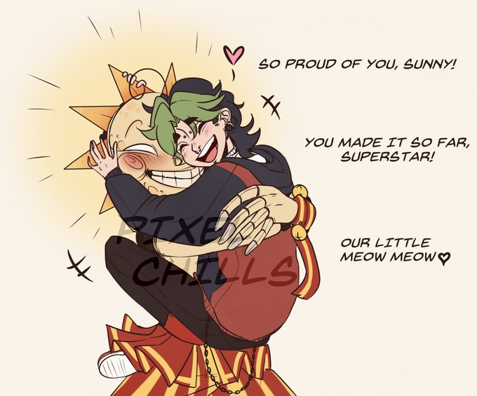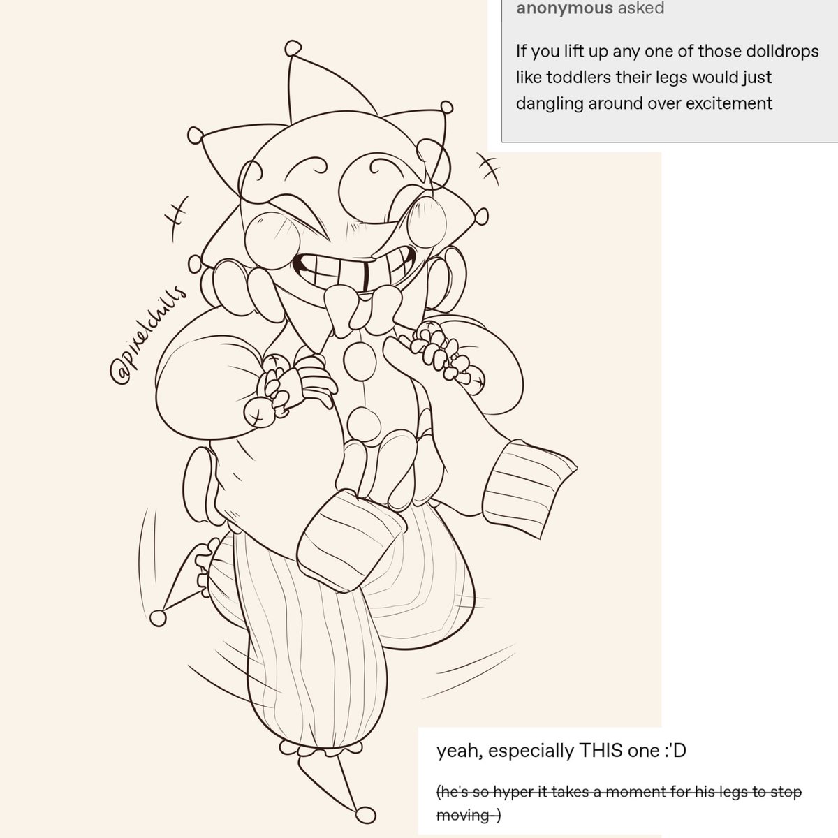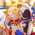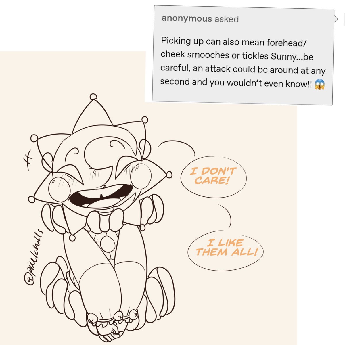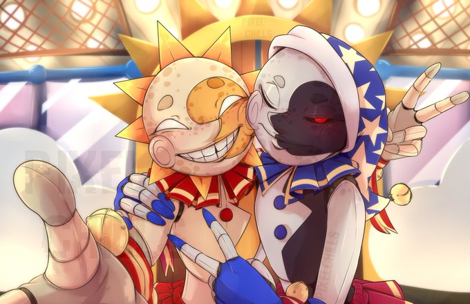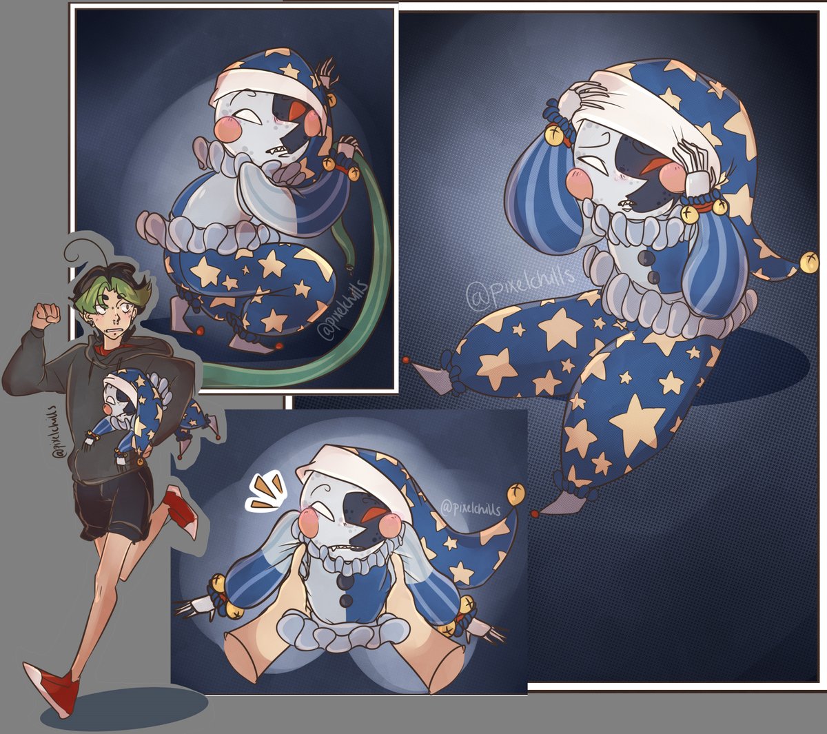 More attempts to get rid of the artblock. Little gift sketch for @BoneJanky of our cute dollboyos together! Patch probably cracked the funniest joke in a history that has DD Sunny rolling :D #dolldrops #fnafsun #fnafmoon
