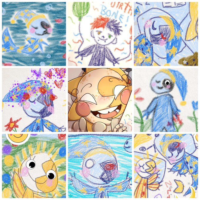 When my arm got injured in early summer, I wasn't allowed to draw for 2 months. So Dolldrop Sun took over for me momentarily on Instagram, and I think he deserves this little spotlight of the #artvsartist2022 😆 Featuring @BoneJanky on the top middle! #dolldrops