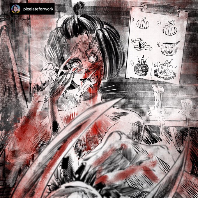 Have some (dark) arts and crafts! Some jack o lantern, although I think we’re forgetting something. Today’s #dailypostpunk Check out my wares, traveler: pixelateforwork.threadless.com #goth #daily #sketch #illustration #digitalart #gothic #horror #gore #pumpkin #inktober #bodyhorror