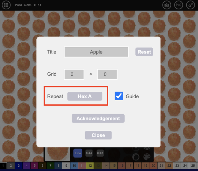1 1 ひっそりとリピート機能(タイル表示)をリリースしました。設定は右上のギアのアイコンからお願いします。 遊んでみてください。あと要望あったら対応しますよー♪ #pixelart #ドット絵 #pixeltool #pixnote 21/06/17 22:11
