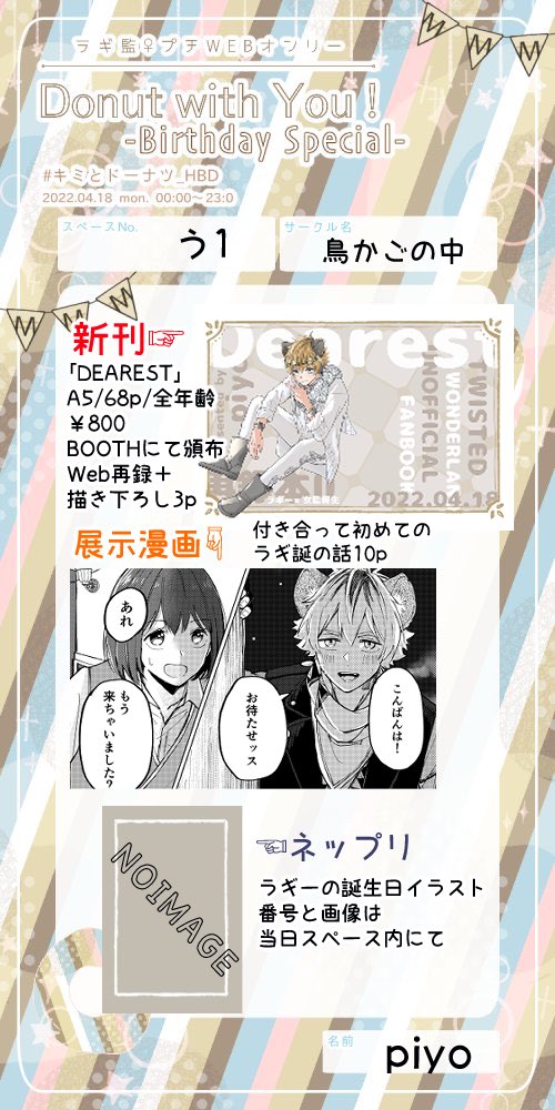4月18日ラギ監♀Webオンリー「Donut with You!-Birthday Special-」に参加します🎂 色々と用意できたので良かったら遊びに来てください~😸 #キミとドーナツ_HBD