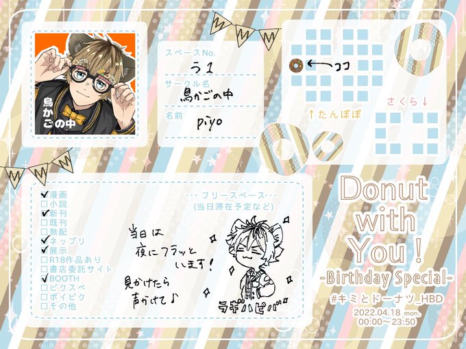 24 62 4月18日ラギ監♀Webオンリー「Donut with You!-Birthday Special-」に参加します🎂 色々と用意できたので良かったら遊びに来てください~😸 #キミとドーナツ_HBD 22/04/16 19:12