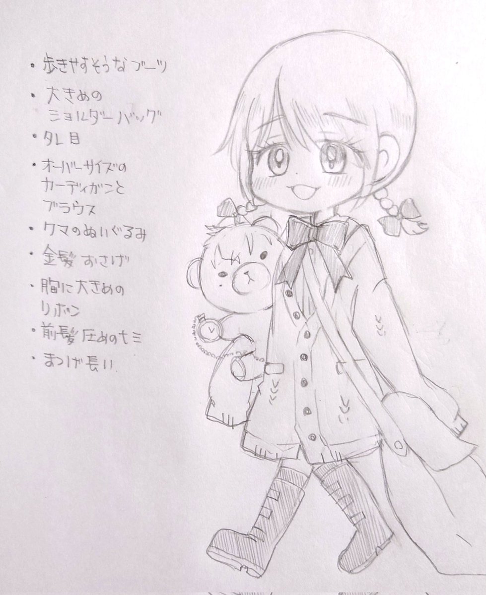 貰ったイメージで魔法使いつくるやつ描きましたー🧙♀✨✨ ありがとうございます〜!! ・あるきやすそうなブーツ ・大きめショルダーバッグ ・タレ目 ・オーバーサイズのカーディガンとブラウス ・クマのぬいぐるみ ・金髪おさげ ・大きめリボン ・前髪厚めの七三 ・まつ毛長い twitter.com/piyobucyo/stat…