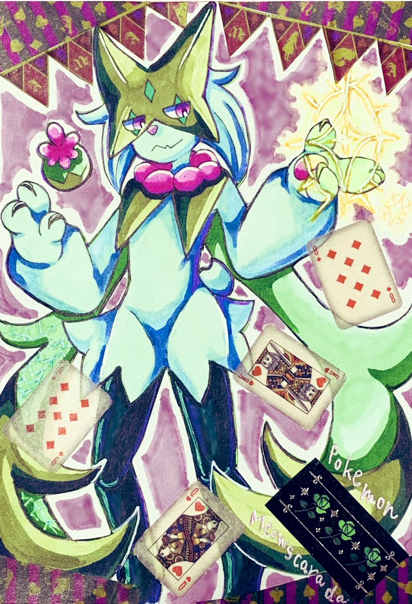 お題ありがとうございます! ポケモンsvのマスカーニャ描かせていただきました🎭🐈⬛ 俺はホゲータ選んだから、ネモ姉貴が使ってたマスカーニャカッコよかったなって印象なんだぜ! まだまだお題募集しとるゾォイ twitter.com/piyopiyotakesh…
