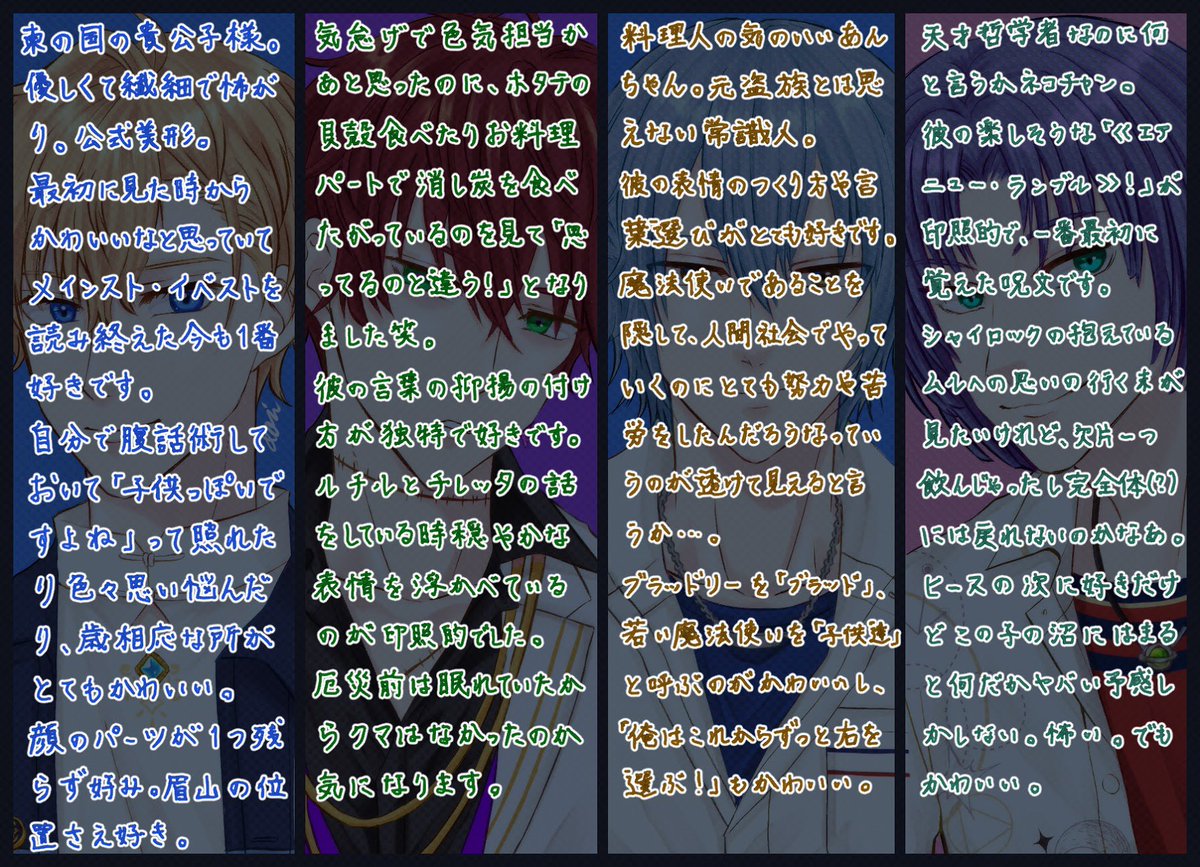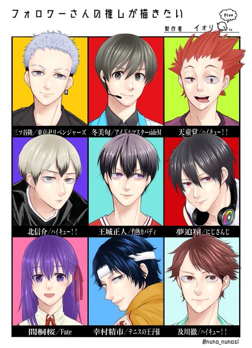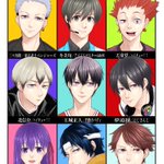 タグ絵やっと描き上がりました〜 灼メインやのに私が勝手に描いた王城くん以外灼の子おらん上1回だけ描いたことある子が2人、未履修作品4人とおもろいことになってます🐣 #フォロワーさんの推しが描きたい