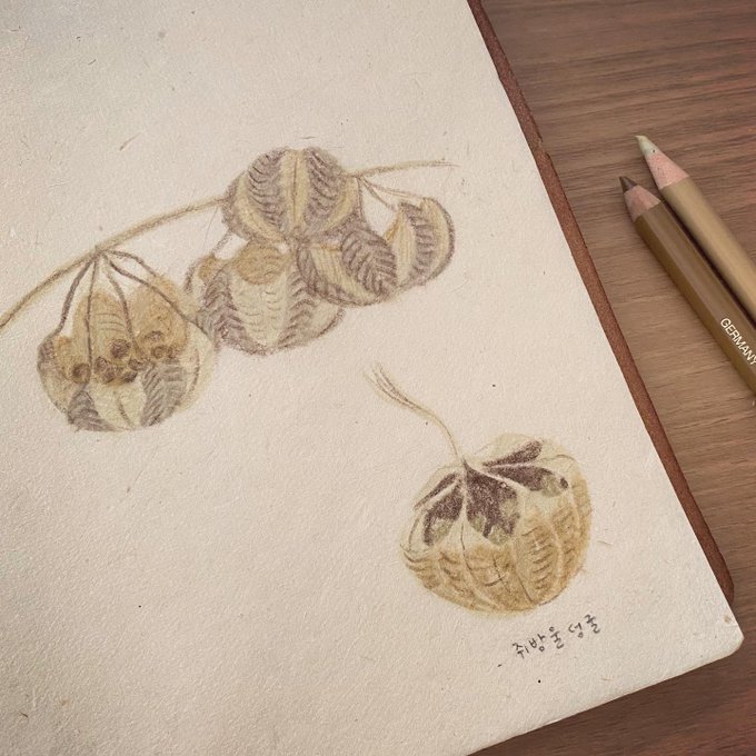 쥐방울덩굴.나무에 주렁주렁 매달려있어서 다가가서 떼어보니 풍선 같기도 하고 낙하산 같기도 한 주머니에 씨앗이 잔뜩 들어있었다.줄기째로 들어보니 등불 같기도 하고 아름다웠다.느릿느릿 산책하고 수집하고 숲을 그리고 싶어서 매일 멀리서 보고 가까이에서 보고 그리고. instagram.com/pjekr twitter.com/i/web/status/1…