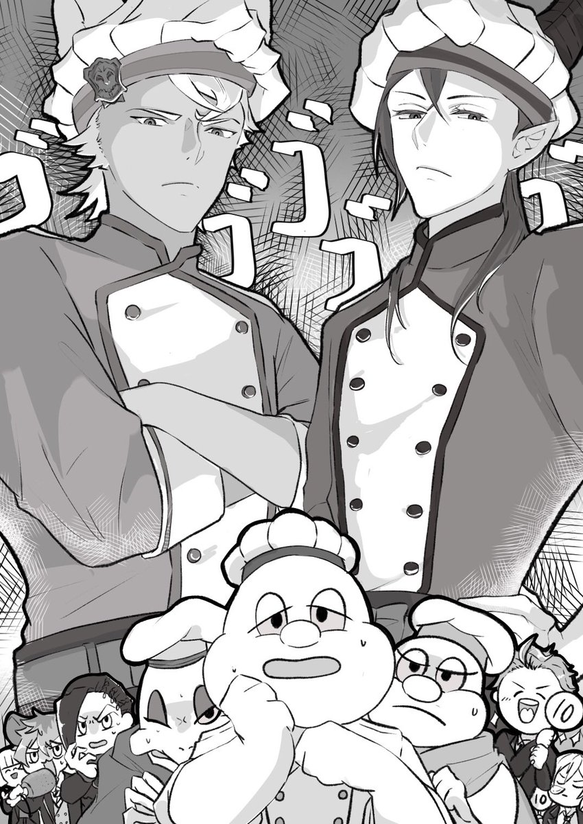 ⚠︎妄想⚠︎ マスターシェフ 〜スイーツの幸福〜 威圧感に負けず、お菓子の作り方を教えなければならないシェフゴーストと、次期国王が丹精込めて作ったケーキに点数をつけなければならない審査員の皆さんです。 #ツイステファンアート
