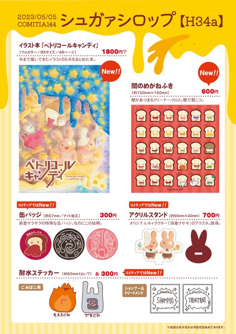 【 #コミティア144 お品書き 】 5/5の #COMITIA144 に参加します! 新刊は今まで描いてきたイラストのまとめ本、新作グッズはじゃむぱんのめがねふきです。 その他缶バッジなどいつもの顔ぶれも持ち込みます。よろしくお願いします!🐰🍞⭐️ #COMITIA144お品書き #コミティア144お品書き