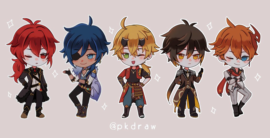I realized I never posted these chibis I did a while ago!! I also drew scaramouche but I just couldn't fit him with his dumb hat LOL maybe I'll post him later--- #GenshinImpact #原神 #diluc #kaeya #thoma #zhongli #tartaglia