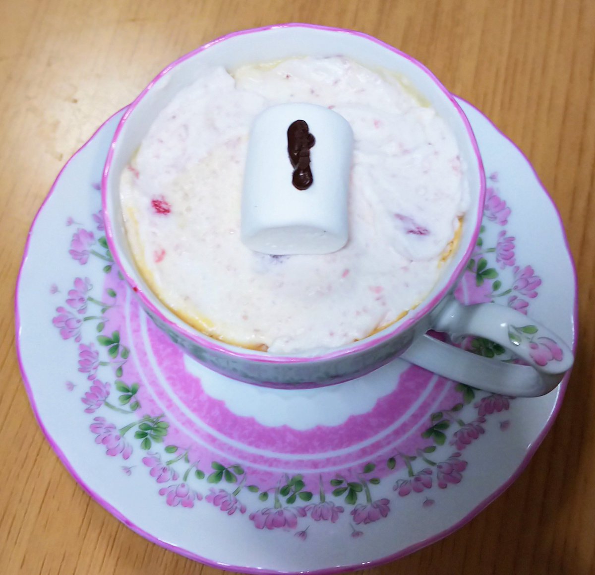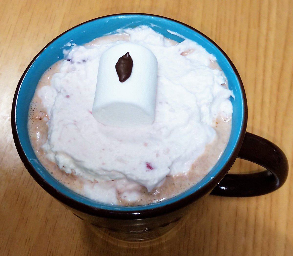 #破壊神マグちゃん混沌芸術祭 #破壊神マグちゃん 【マグちゃんのウインナティー&ココア】 以前公開されていたモチーフドリンクを参考に チョコペンで目を描いたマシュマロを乗っけました👁️🗨️ 生クリームにはリンゴジャムを混ぜてピンクに ホットなので生クリームがすぐ溶けて混沌と化しました😅