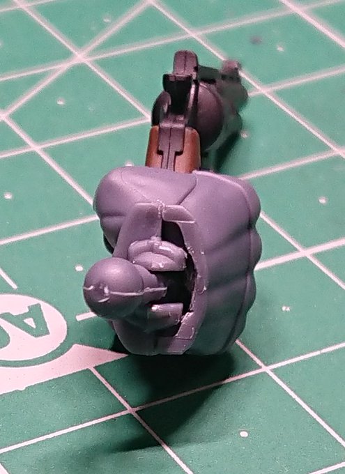 アオシマ リアクティブアーマー どうしても正面両手で構えさせたかったので知恵を振り絞ったところ…手首を少し削れば可動範囲が少し広がる事に気づきました…スナップが効くようになったので個人的には満足です。首の下のガラスは色々な解釈がある中で自分はスモークにしました。 #パトレイバー模型部