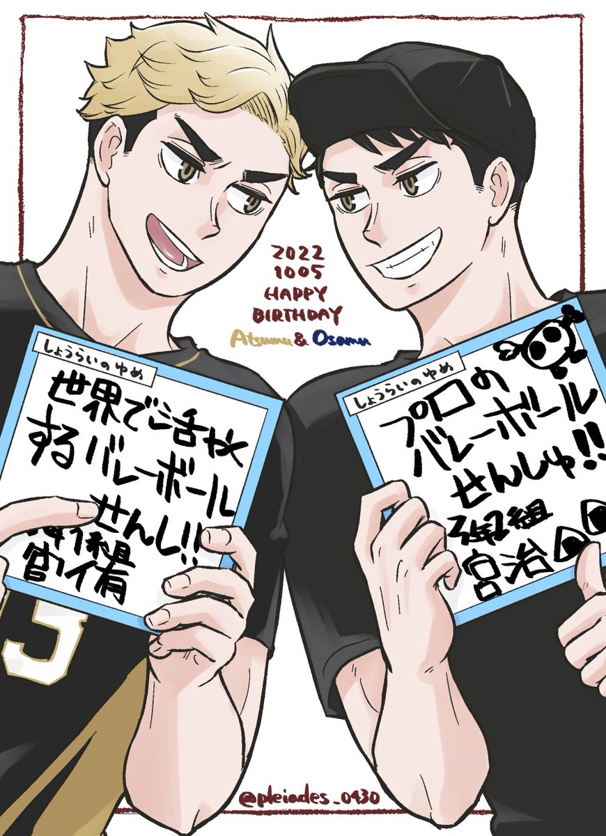 母「あんたらが子供ん時に書いた色紙が出てきたんやけどw」 治「お前っせんしってなんやねんwバレーボール戦士w」 侑「うっさいわ!俺のが有言実行や!俺の勝ちやな!」 治「いや俺やってちゃんとおにぎり描いてるし」 侑「それそん時に腹減っとっただけやろ!」 #宮兄弟誕生祭2022 #宮兄弟生誕祭2022